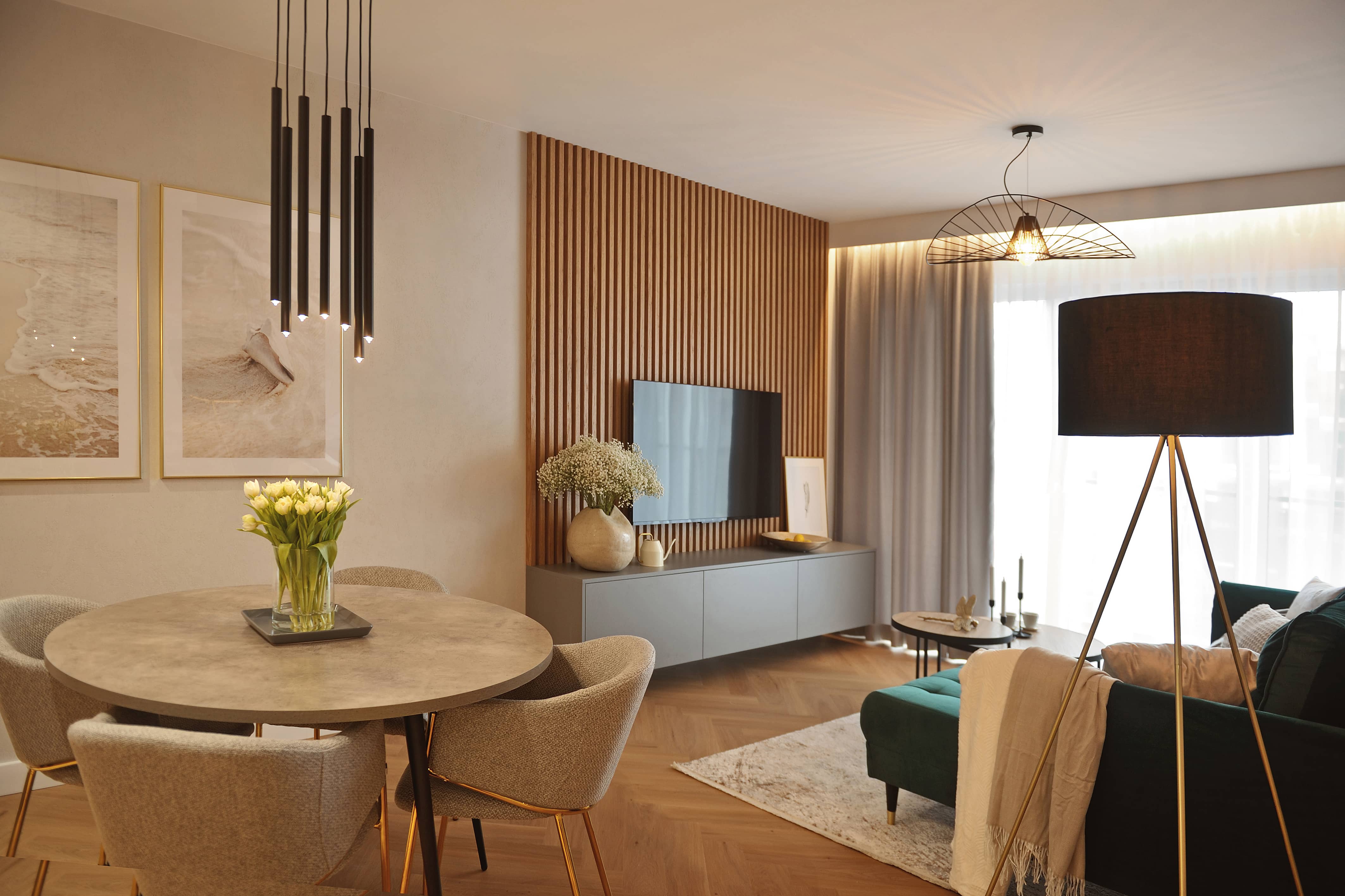W tym wnętrzu można poczuć prawdziwe odprężenie. Sprzyjają temu komfortowe elementy wystroju, jak akcenty nawiązujące do natury, na czele z zielenią. Wprowadzona została jako barwa kilku komponentów aranżacji, ale tez jako żywa roślinność. Ale w całym apartamencie to odcienie szarości, bieli, beżów i ciepłe wybarwienie jasnego drewna tworzą wiodący zestaw kolorów. Dla przełamania oraz wyrazistości pojawia się też czerń.