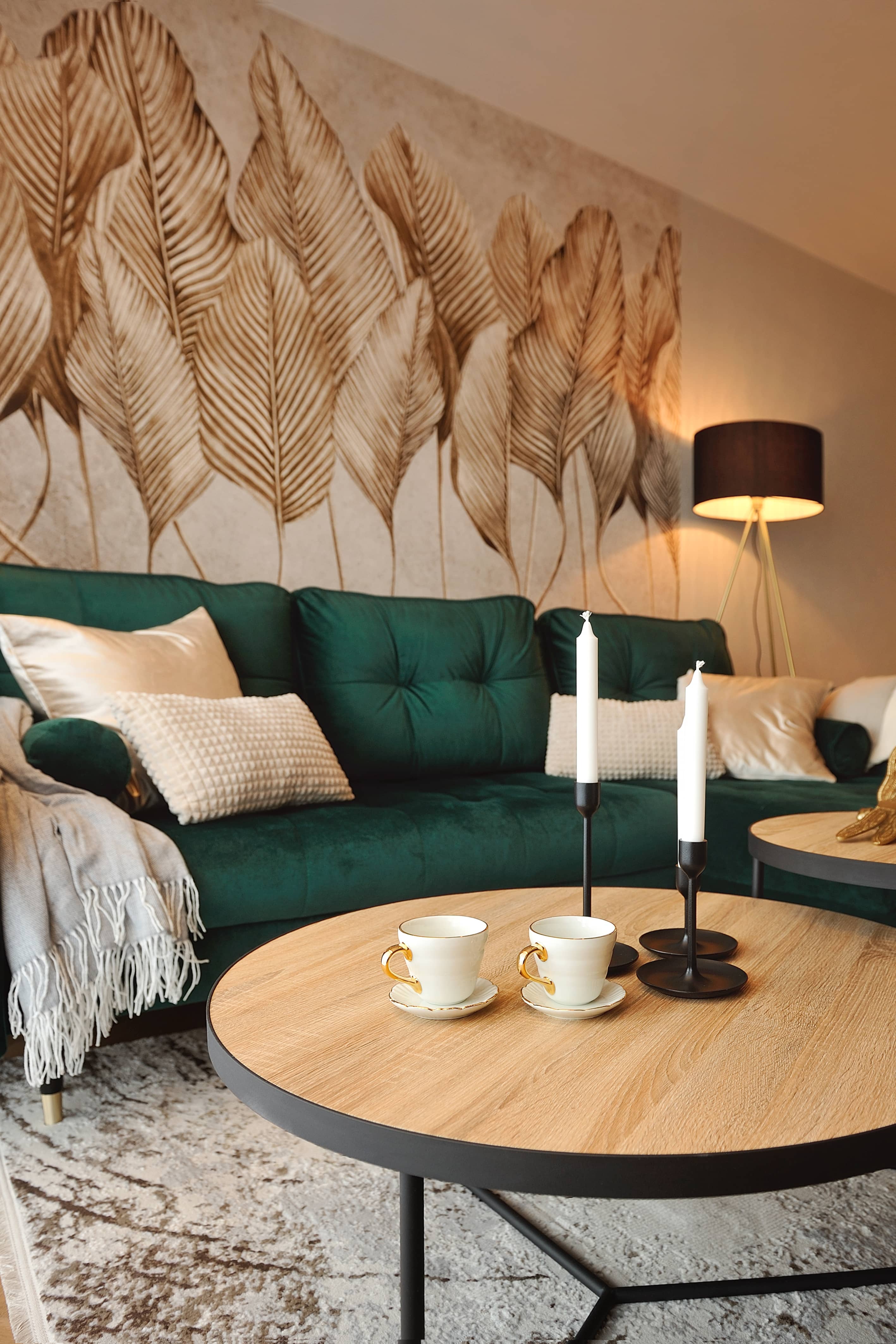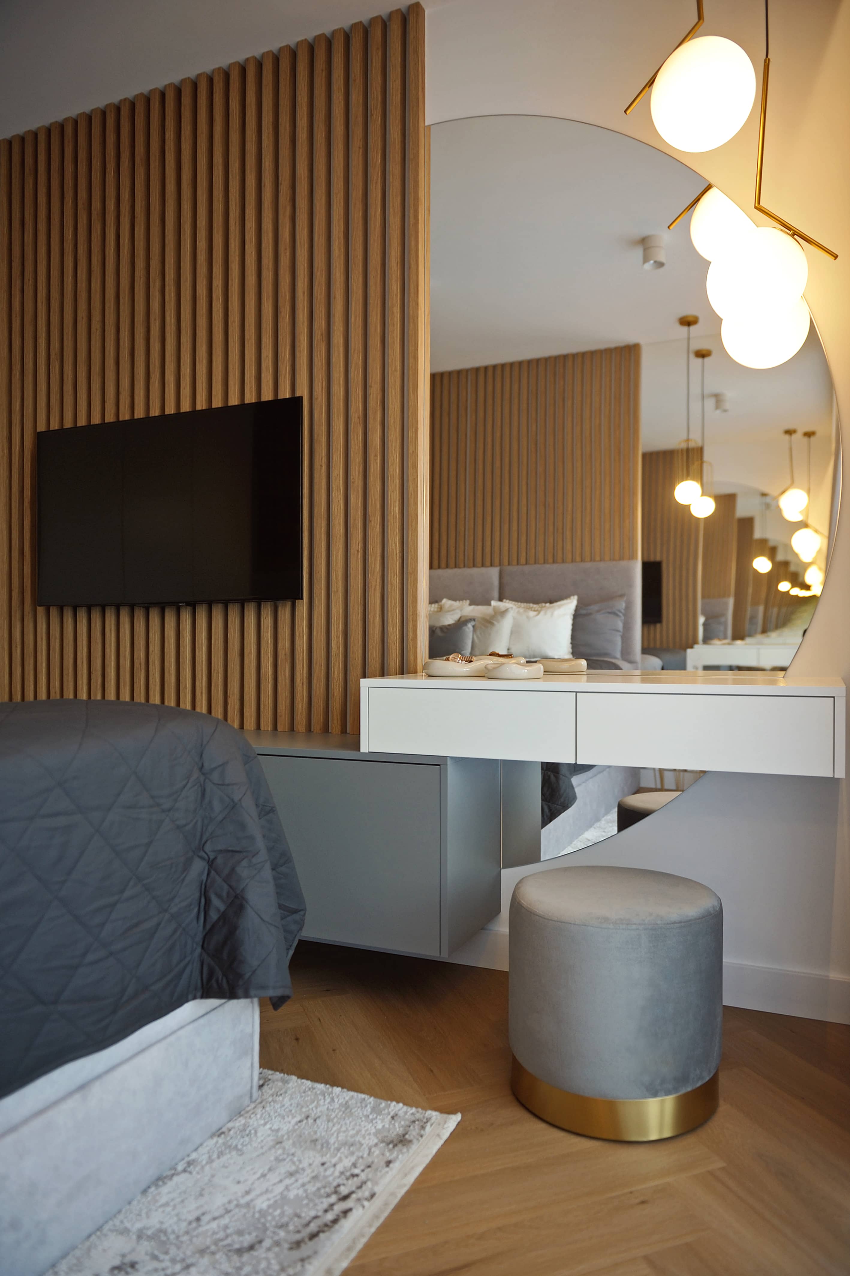 W tym wnętrzu można poczuć prawdziwe odprężenie. Sprzyjają temu komfortowe elementy wystroju, jak akcenty nawiązujące do natury, na czele z zielenią. Wprowadzona została jako barwa kilku komponentów aranżacji, ale tez jako żywa roślinność. Ale w całym apartamencie to odcienie szarości, bieli, beżów i ciepłe wybarwienie jasnego drewna tworzą wiodący zestaw kolorów. Dla przełamania oraz wyrazistości pojawia się też czerń.